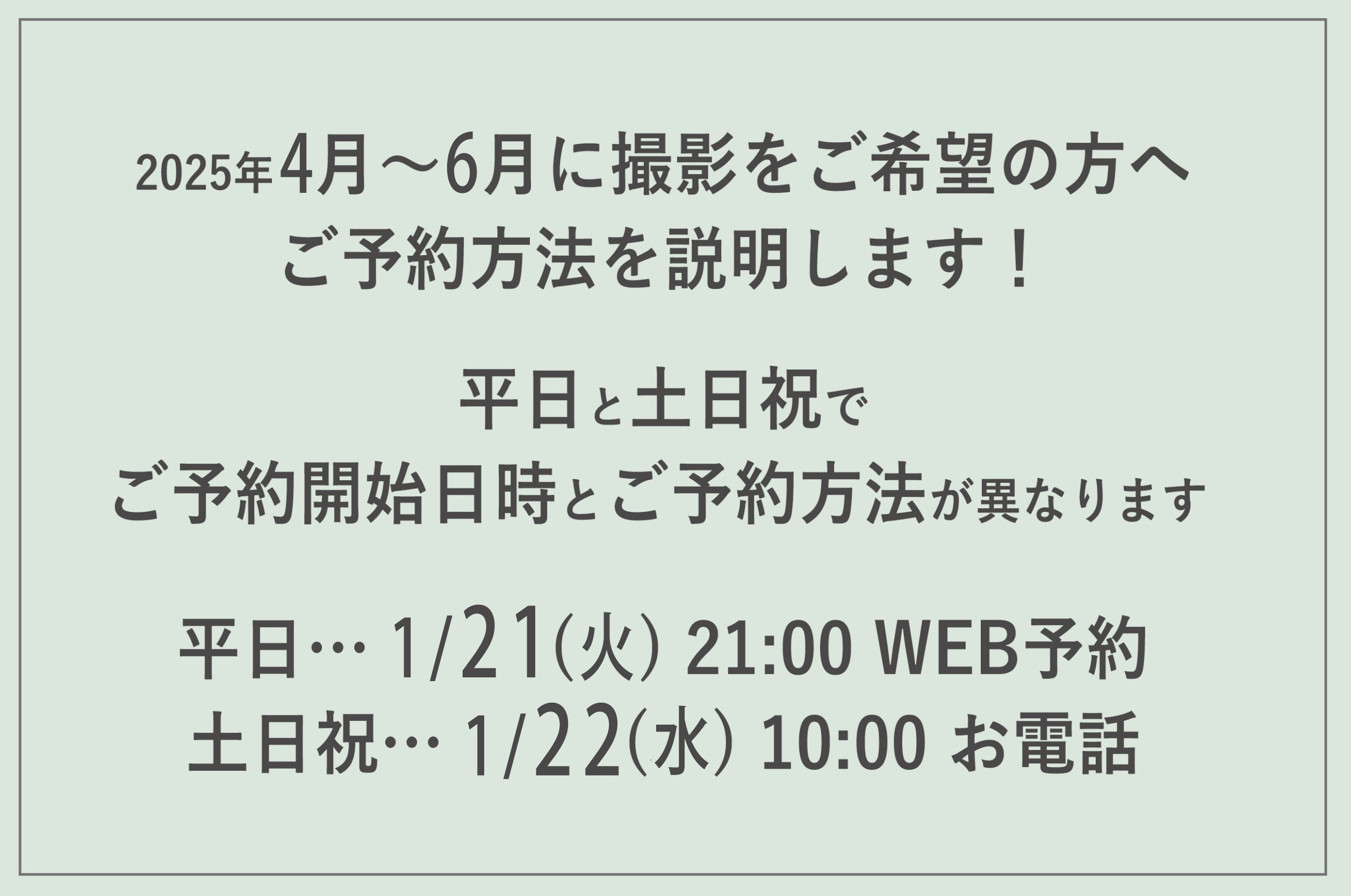 土日祝の予約が希望だけど、予約が取れなかった時の為に、1/21のご予約スタートの時点で平日をご予約いただく事も可能です。