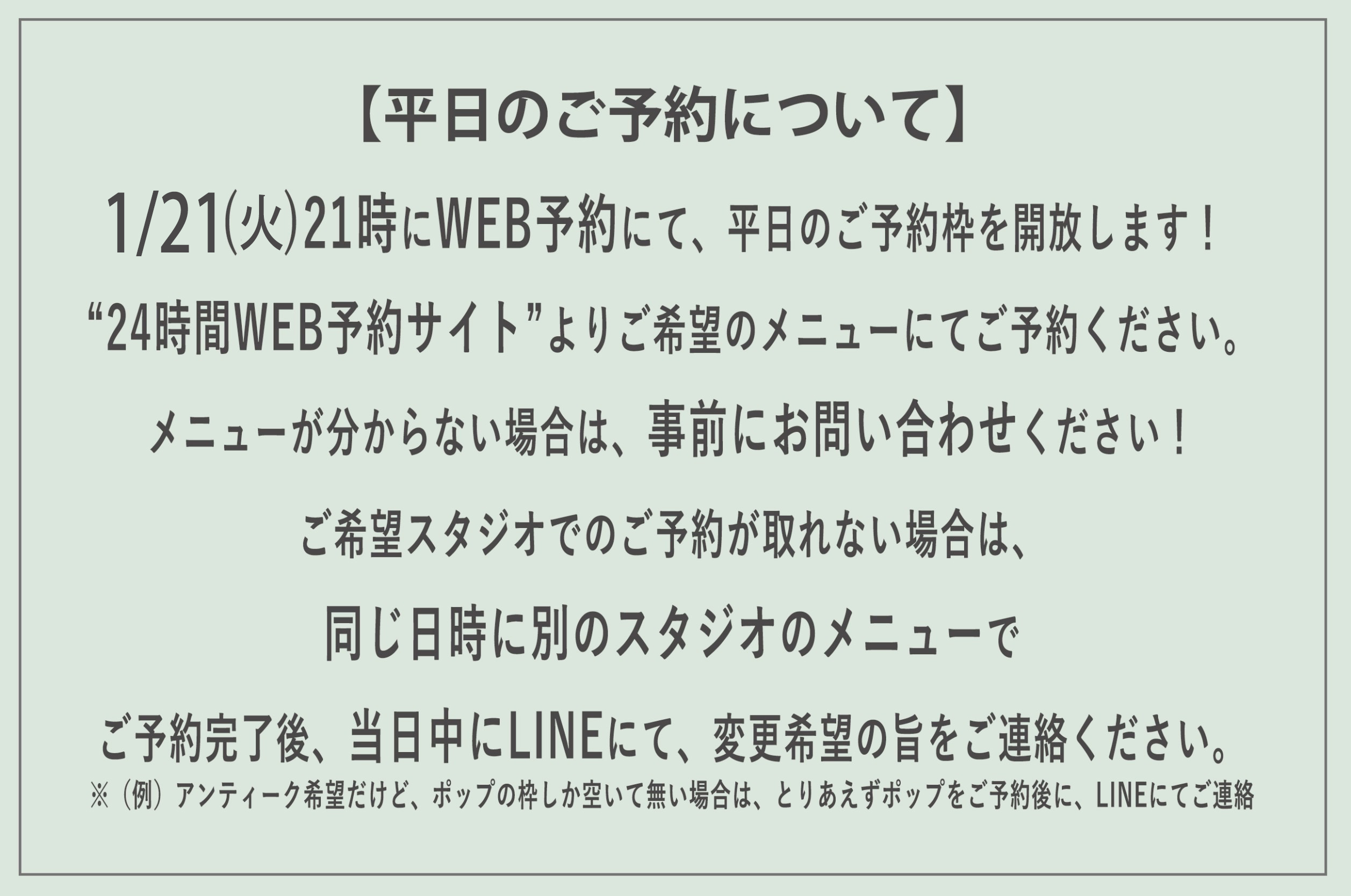 1/21(火)21時にWEB予約にて、平日のご予約枠を開放!