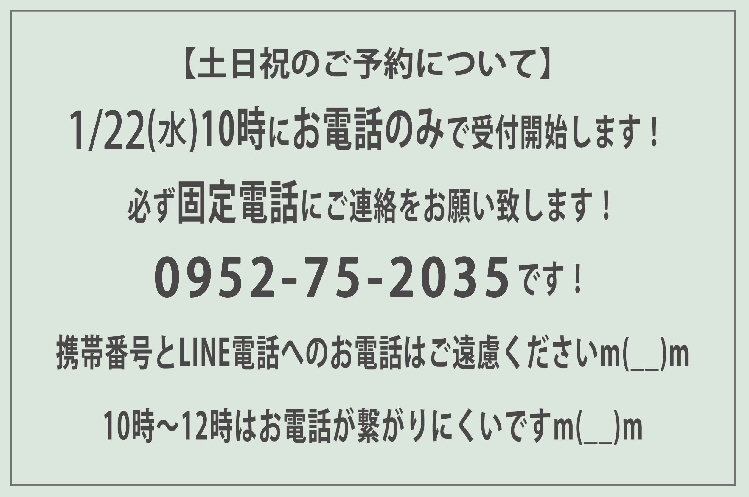 1/22(水)10時にお電話で受付開始!