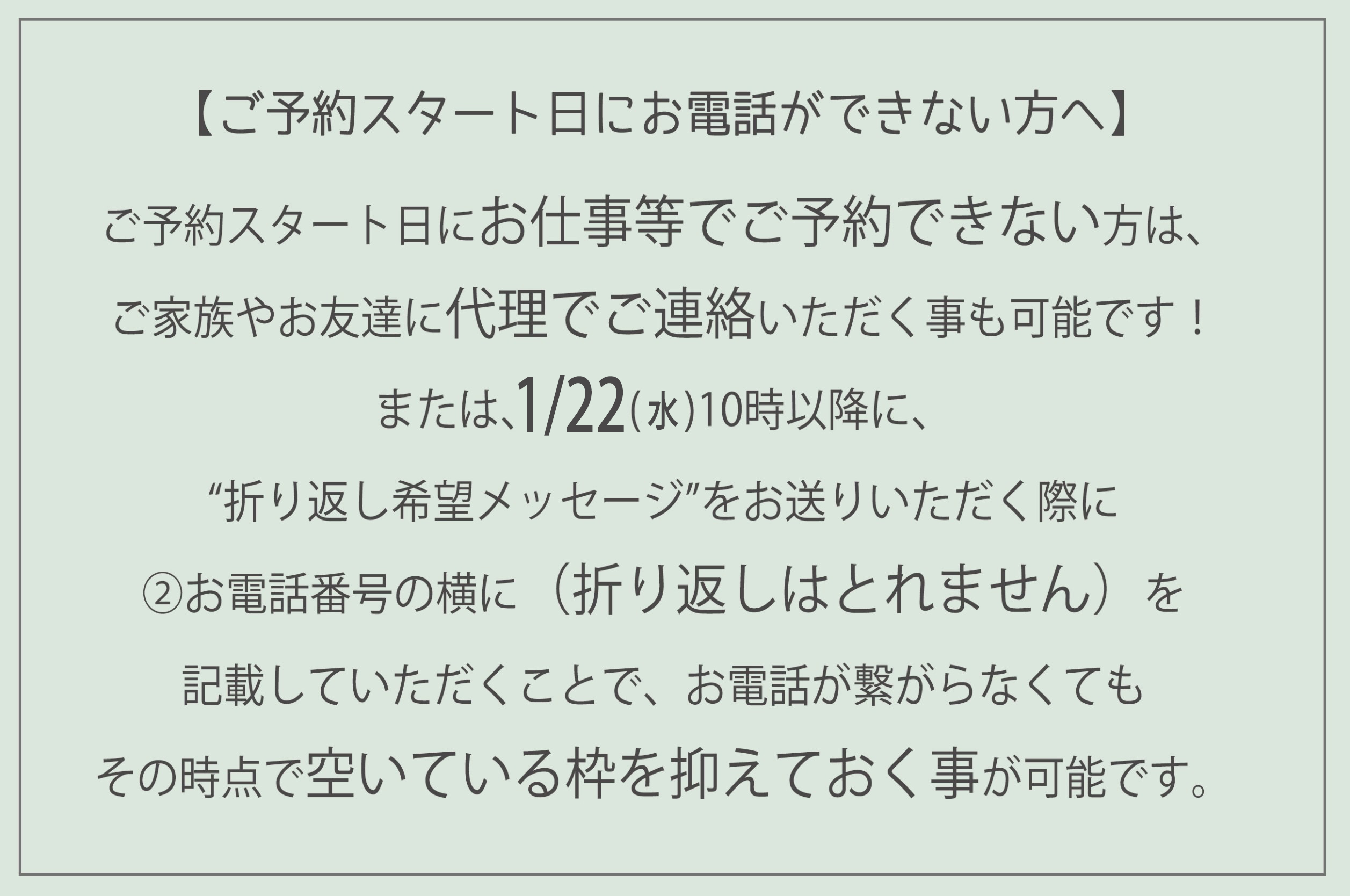 ご予約スタート日が平日ですので、お仕事でお電話ができない場合等は、ご家族やお友達に代理でご連絡いただく事も可能です👍