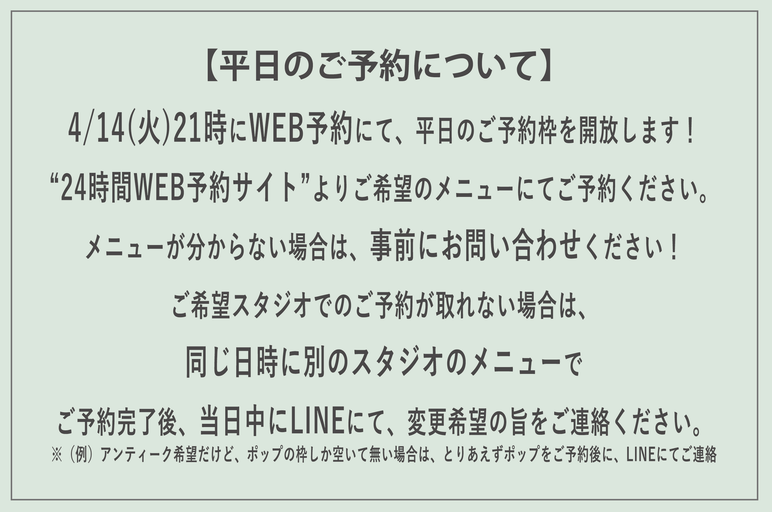 土日祝の予約が希望だけど、予約が取れなかった時の為に、4/14のご予約スタートの時点で平日をご予約いただく事も可能です。