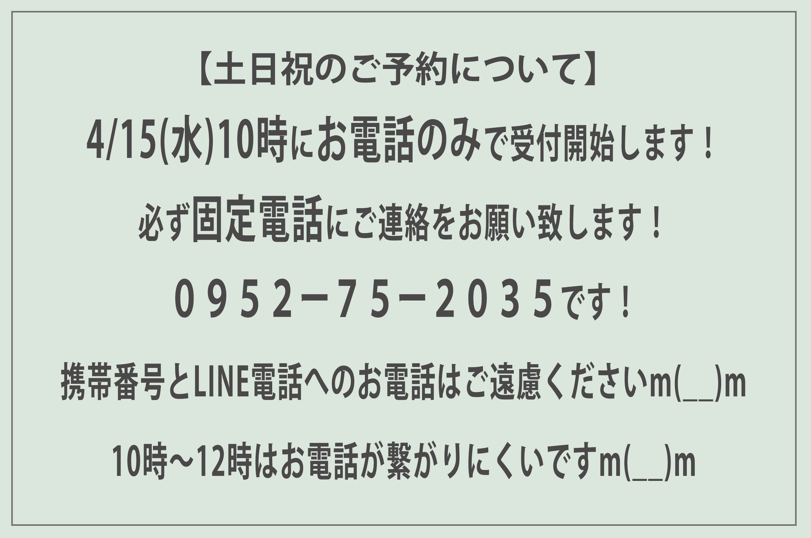 4/15(水)10時にお電話で受付開始!