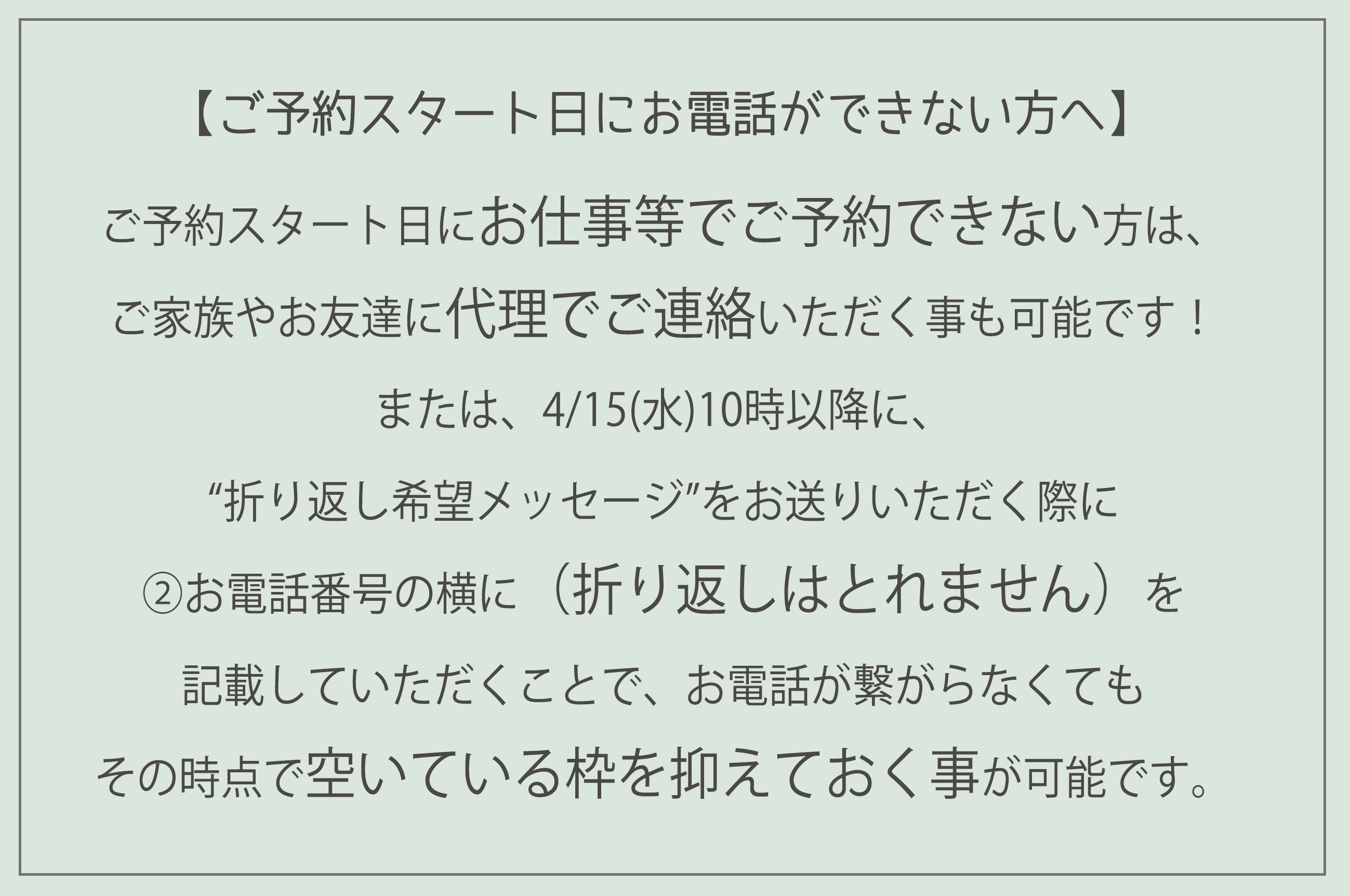 ご予約スタート日が平日ですので、お仕事でお電話ができない場合等は、ご家族やお友達に代理でご連絡いただく事も可能です🙆♀️