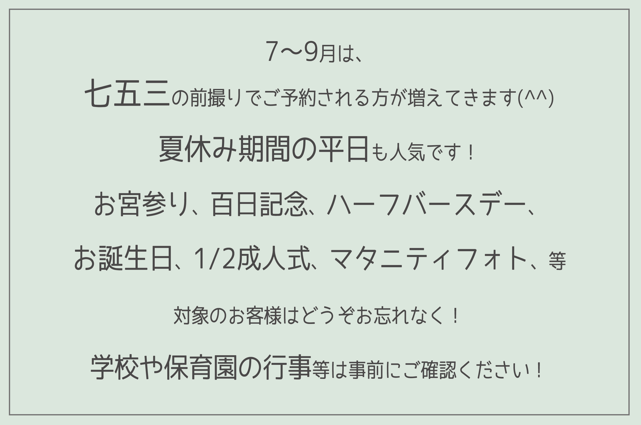 七五三、お宮参り、百日記念、ハーフバースデー、お誕生日、1/2成人式、マタニティフォト、等対象のお客様はどうぞお忘れなく!